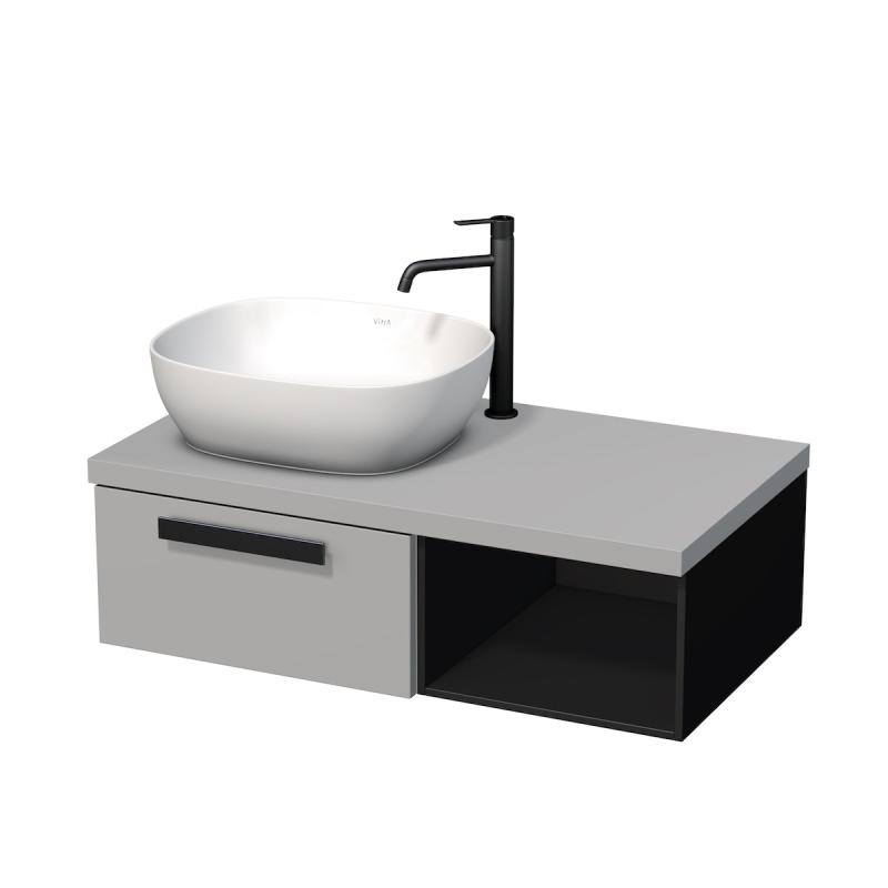 Matný lakovaný povrch se speciální technologií, s úpravou proti zanechávání otisků, tzv. touch povrch. Deska bez otvorů pro sifon a baterii - pro více možností umístění a typů baterií. Černé matné akcenty - police a úchytka.