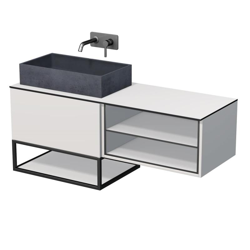 Skříňka je dodávaná ve třech samostatných dílech - skříňka pro umyvadlo s dvěma zásuvkami (smontované), krycí deska s držákem pro ručník vlevo a ALU police v černém laku. Součástí dodávky je potřebný počet konzolí pro uchycení krycí desky.
