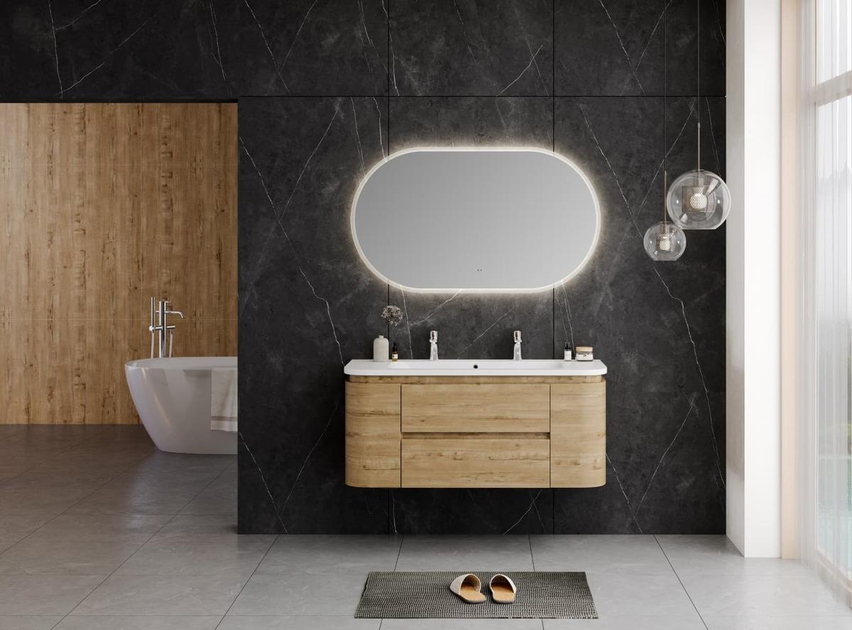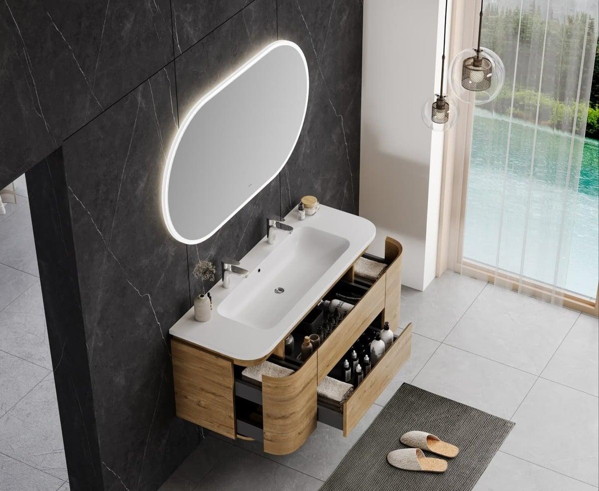 Elegantní závěsná skříňka v přírodním dekoru dubu s jemně zaoblenými liniemi dodá koupelně moderní a nadčasový vzhled. Odolný povrch proti vlhkosti, praktické zásuvky a precizní zpracování zaručují funkčnost i dlouhou životnost.