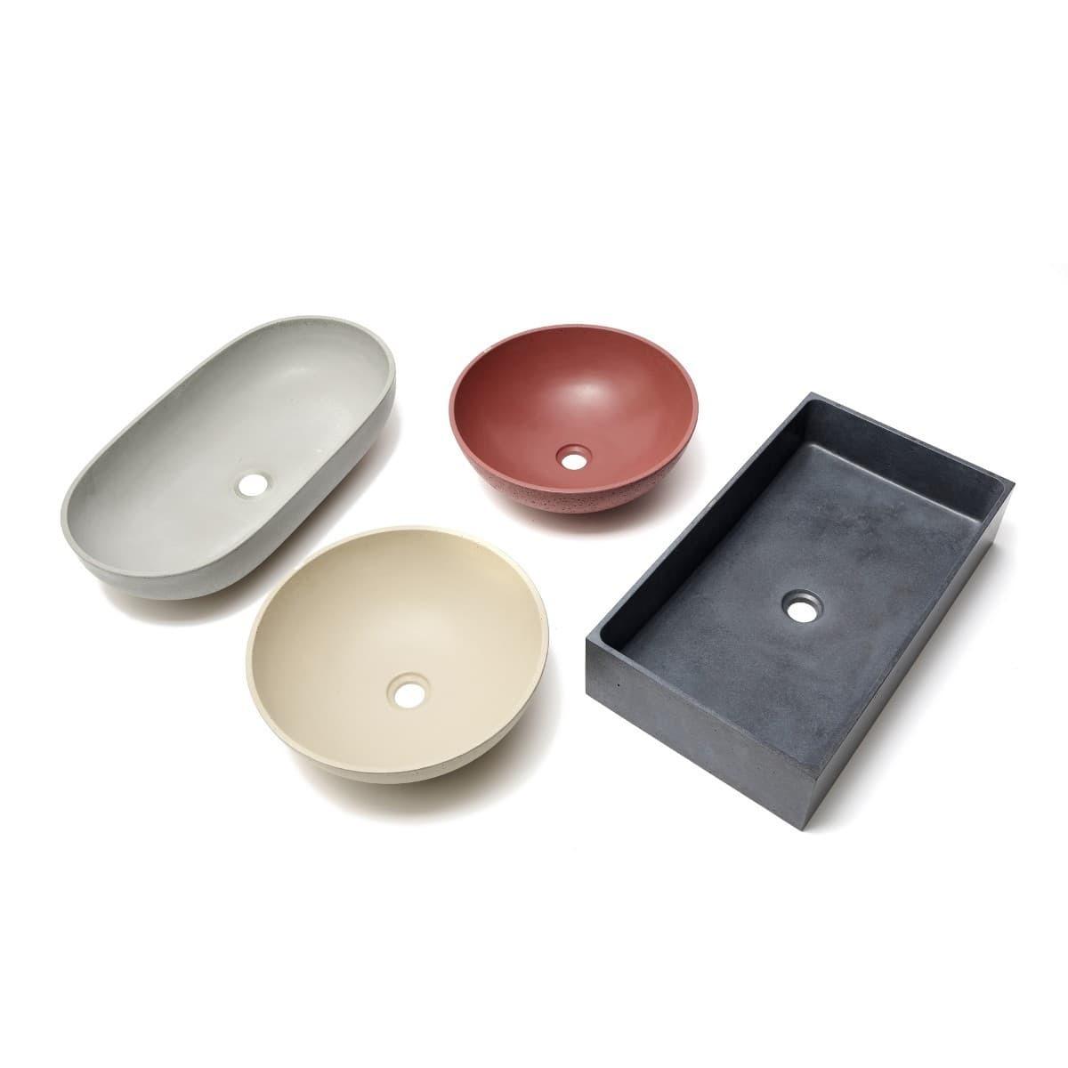 - Designové betonové umyvadlo s tenkými stěnami v antracitové barvě. Beton má jakožto přírodní materiál svůj charakteristický ráz. Má rozdílnou barvu a každý vyrobený kus je originální, mírně odlišný než ten předešlý. Užíváním se mění, nezůstává stejný, může obsahovat malé póry a mikrotrhliny, a právě tyto vlastnosti jsou stěžejními prvky estetična betonu a dávají mu jeho osobitý charakter.