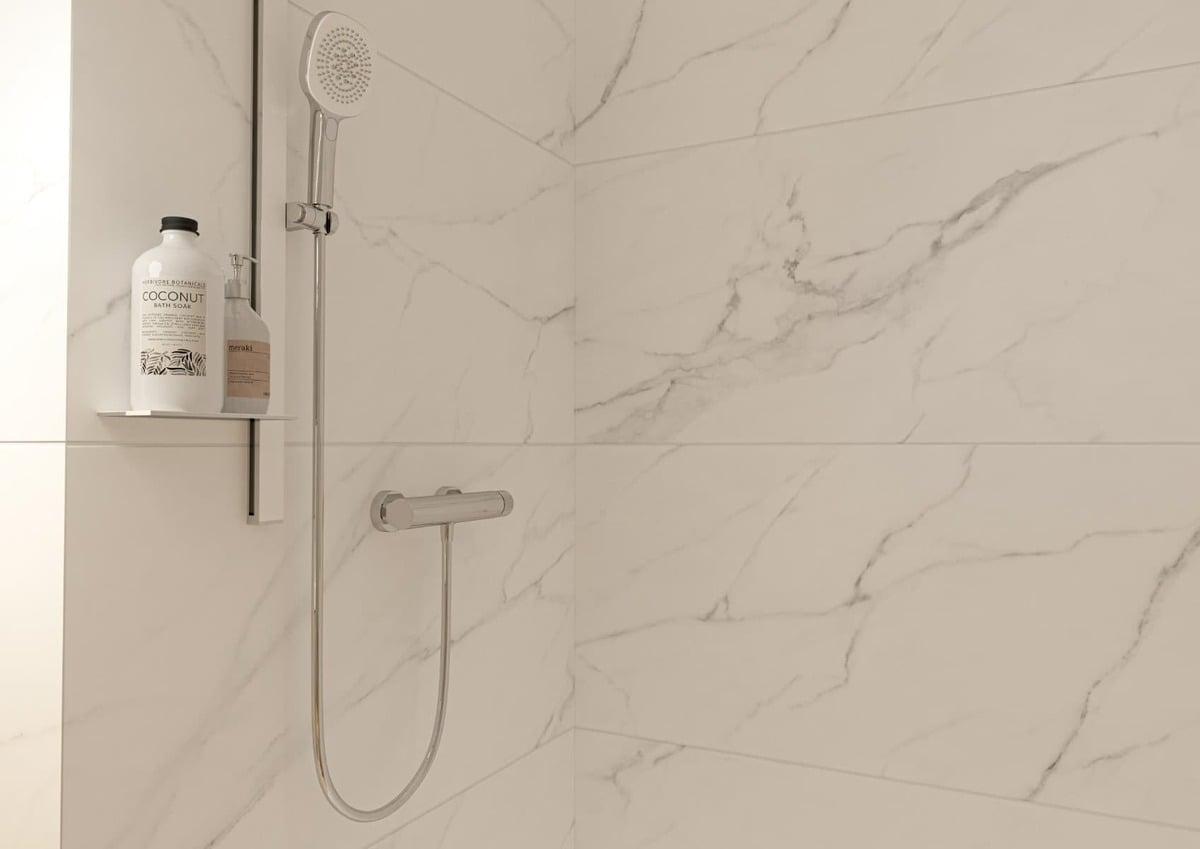 Sprchová tyč má jedinečný design, kdy je umístěna přímo ke stěně, nezabírá tak zbytečně místo a v koupelně působí velmi elegantně. Ušetří 70% prostoru oproti standardní tyči.